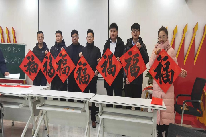 貼“福”字,是迎新春必不可少的傳統項目。每年年末,不少書畫藝術家都會走出書齋,以送“福”的形式來祈福新年。為弘揚中華優秀傳統文化,迎接新春佳節的到來,近日,恒大名都社區黨支部邀請山東省商業職業技術學院書畫教研室曹懷義主任及多位社區書法愛好者走進濟南幸福城小區揮毫潑墨,為居民送“福”到家。能源集團機關黨員、入黨積極分子等20余人參加此次活動。